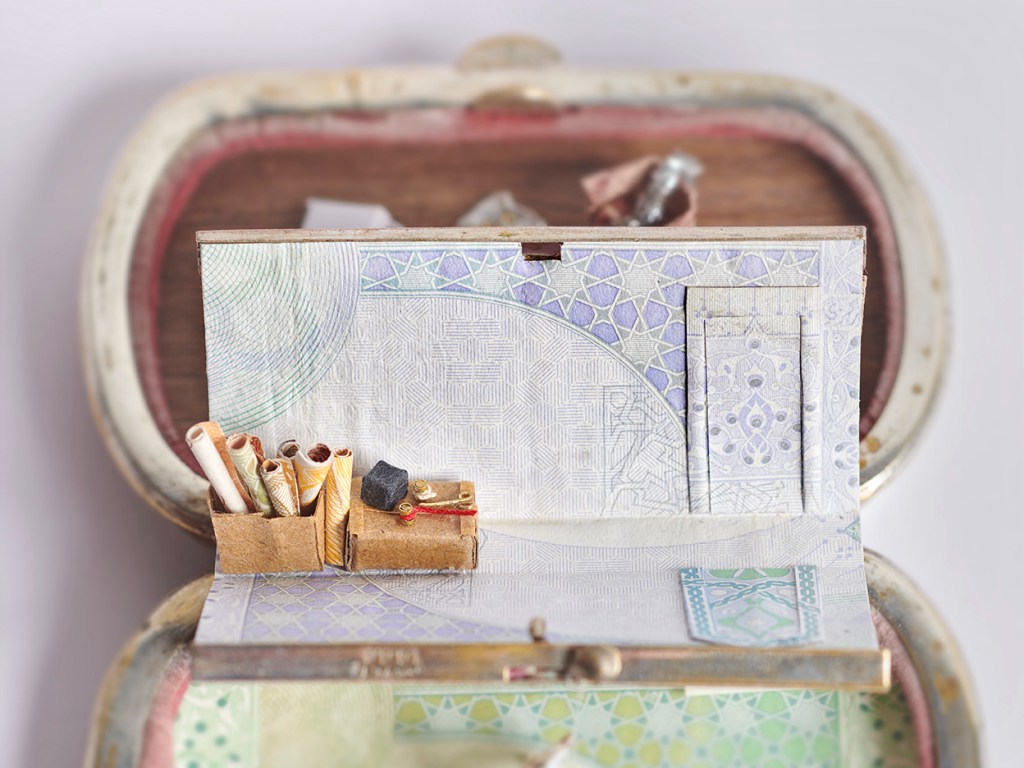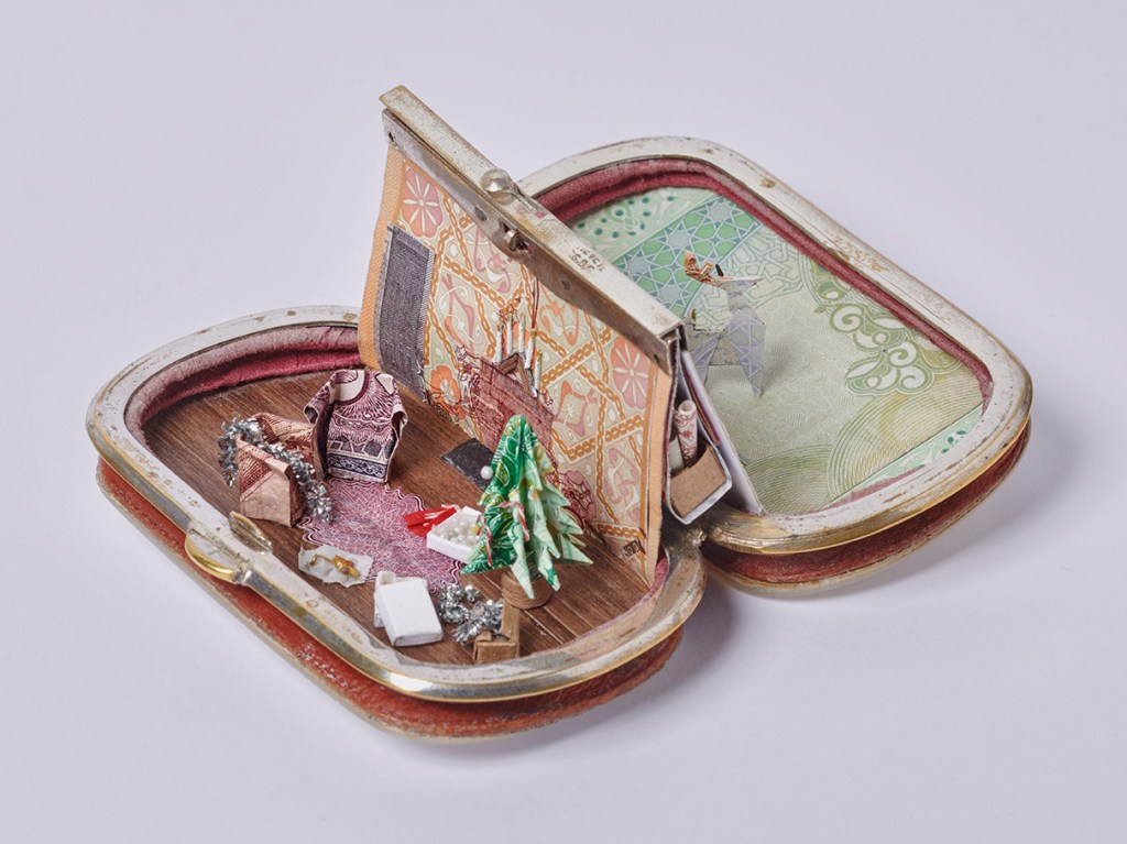 The majority of the interior has been cut and folded, shaped or glued from designs on a selection of old bank notes from around the world. From the bricks on the wall to the curtains in the window, the fire surround and the rug on the floor. Even the Christmas tree. But not the floor: that is walnut wood, the hearth is real slate and the star for the top of the Christmas tree is 9ct gold.