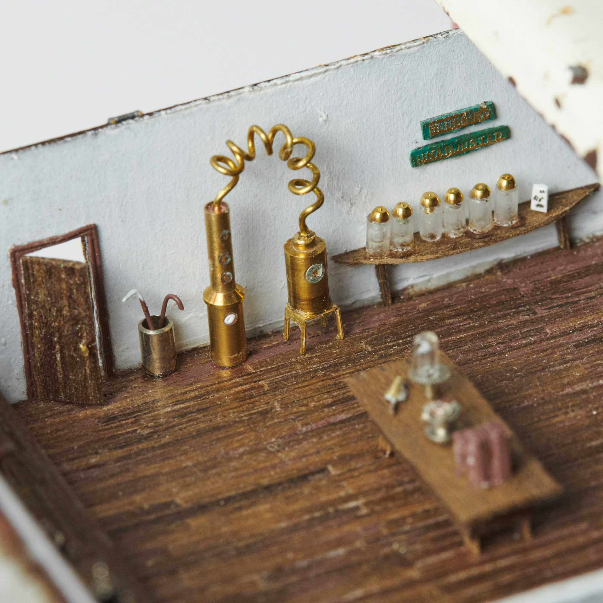 But any one who rang up an imaginary sale would find the chime of the register’s bell heralded an unusual sight. An apothecary for the tiny seeking good health. with working brass scales to measure out the ingredients kept in real glass jars stoppered with brass finials on wooden shelves. A tiny pestle and mortar for creating balms and tinctures. A brass still to brew restorative tonics.