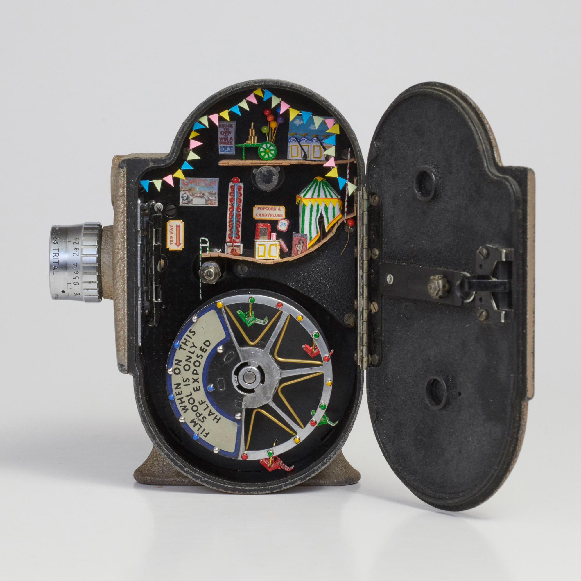 This mid 20th Century movie camera has filmed many hours of family fun. It seems fitting that now you can climb inside and enjoy all the fun of the fair.