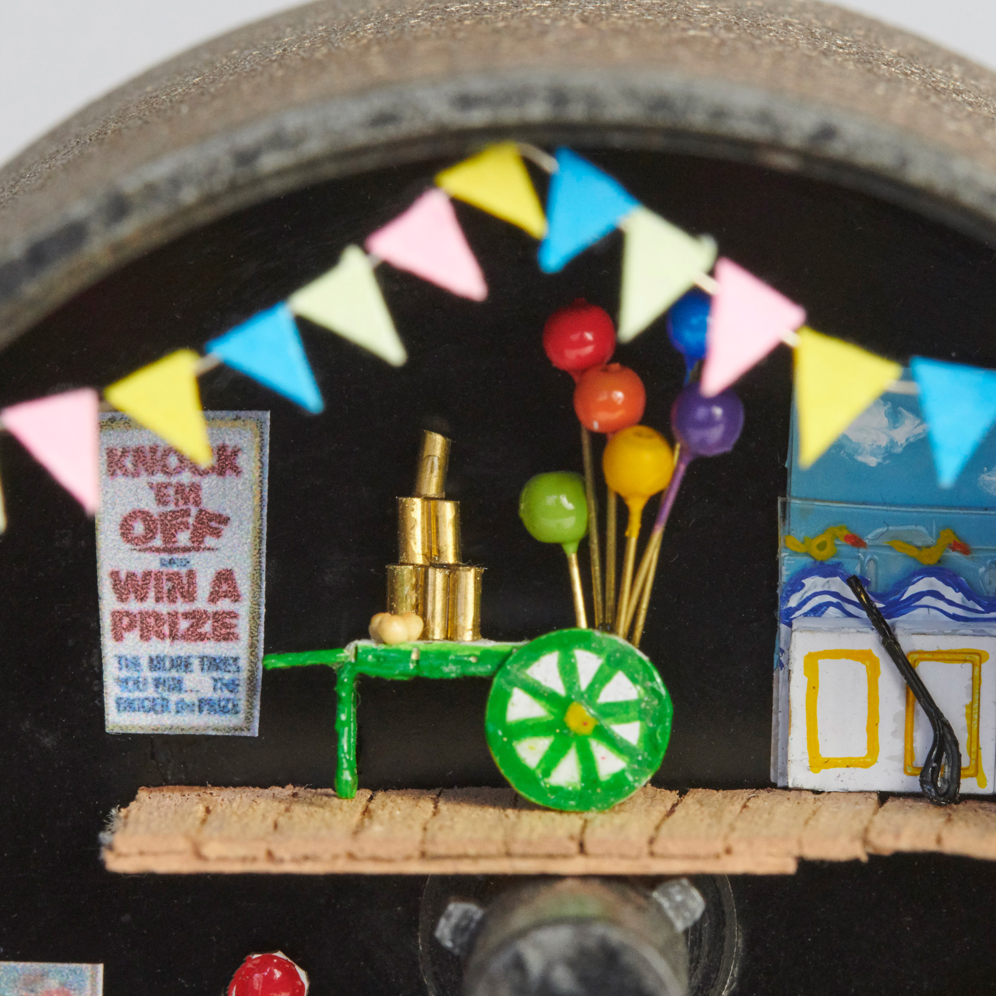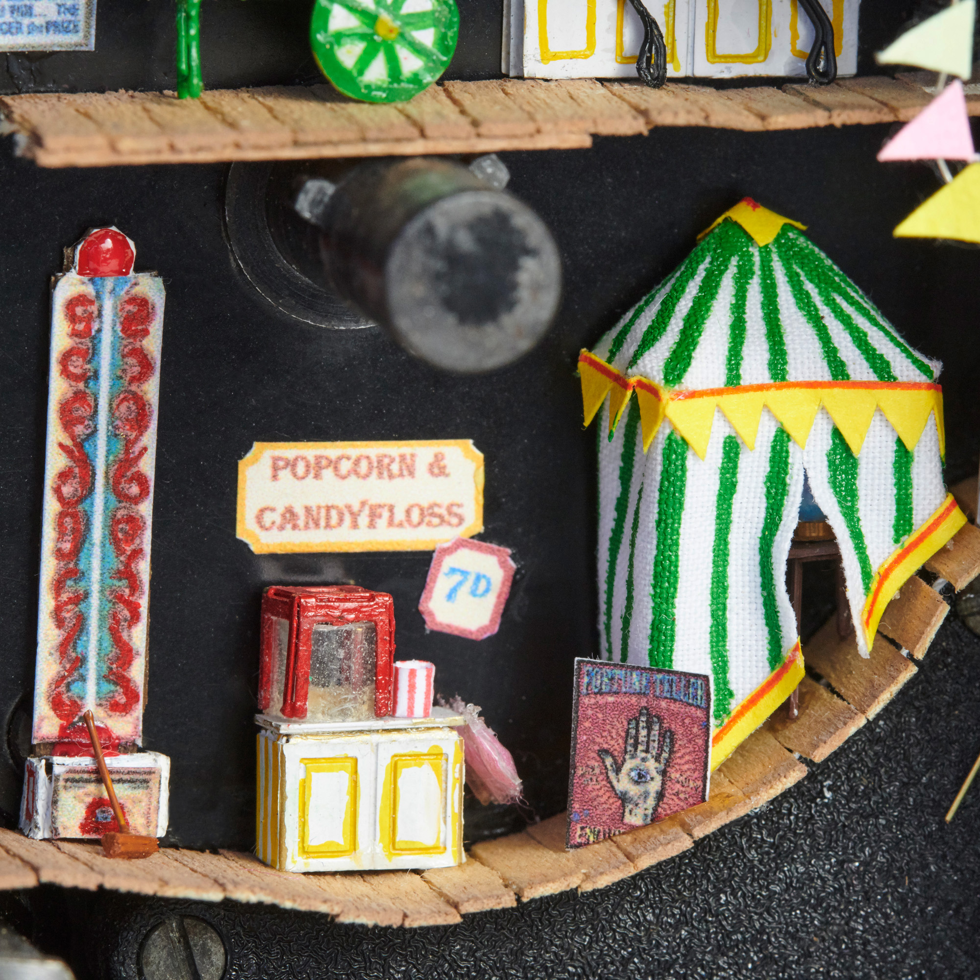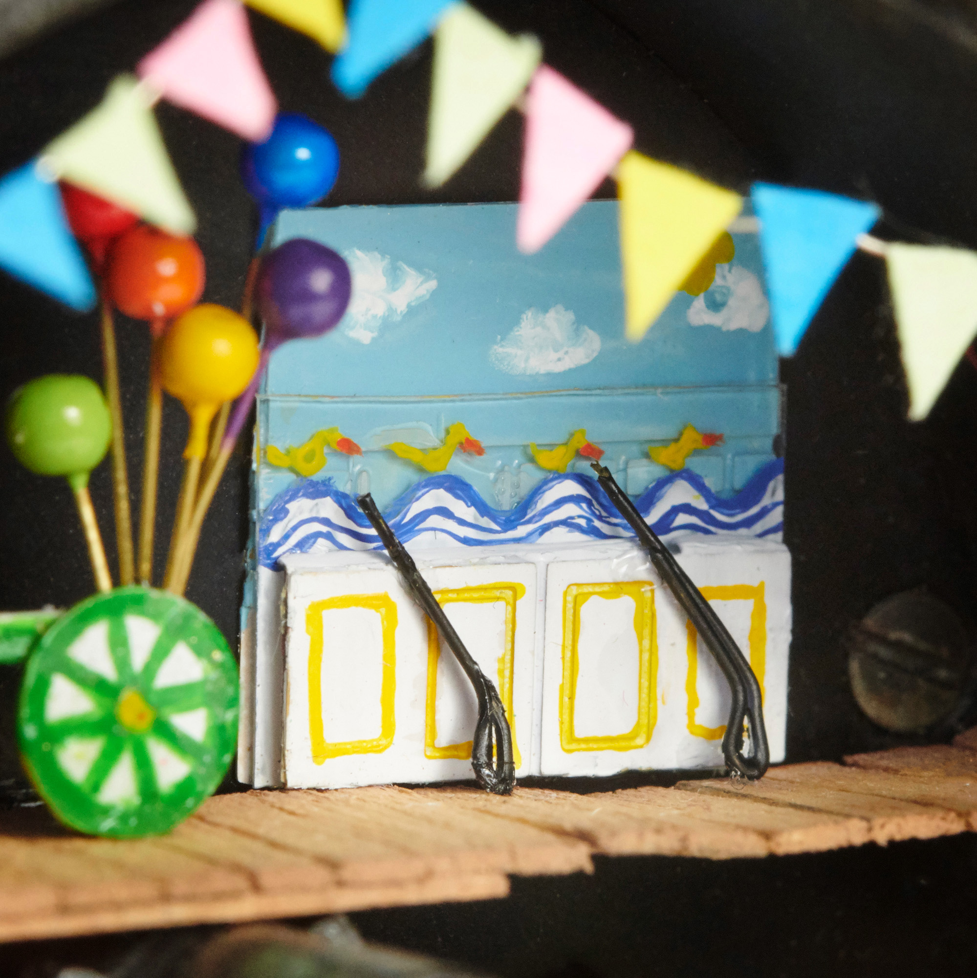 Time for a sit down but it won’t be restful on the thrilling Ferris wheel. Wind up the old camera and press the shutter release to spin the wheel. (For a peek behind the scenes remove the lens cap to see the clown’s dressing room.)