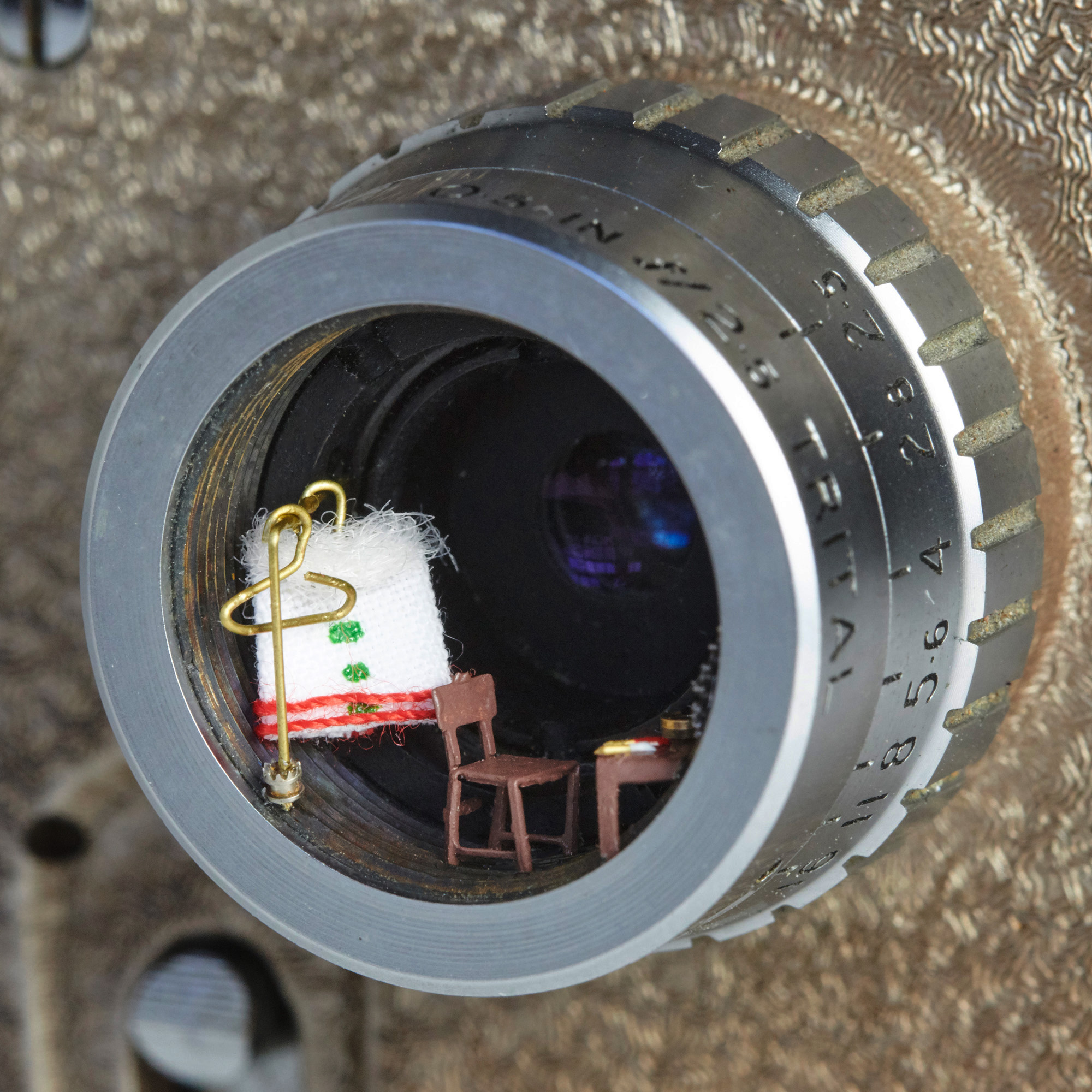 Opal, woven cotton, wool, brass, acrylic paint, paper, iron, acrylic, pine wood.