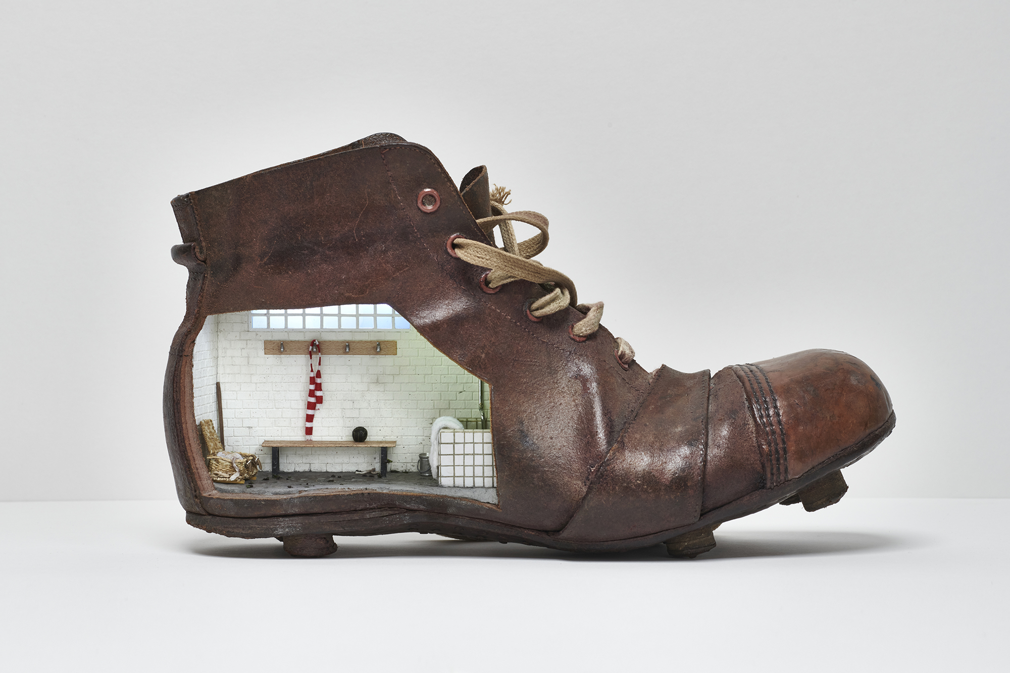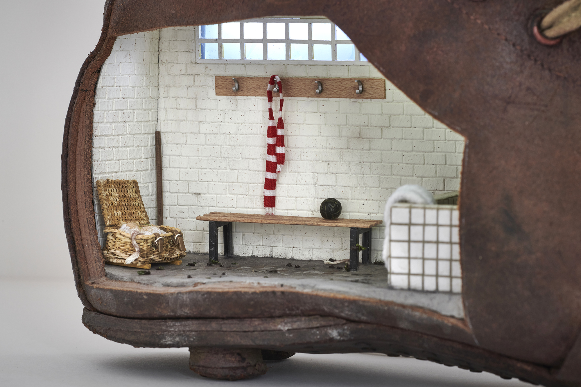 This is half of the piece “His’n’Hers”. A piece that plays with gender stereotypes. This changing room is built inside a well used 1950s football boot and reflects the changing rooms of the 1950s-1970s.