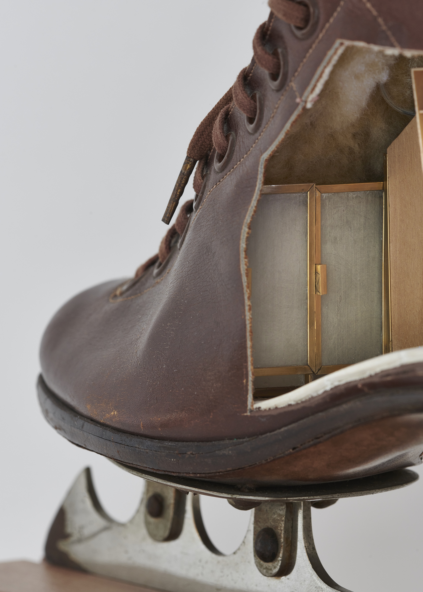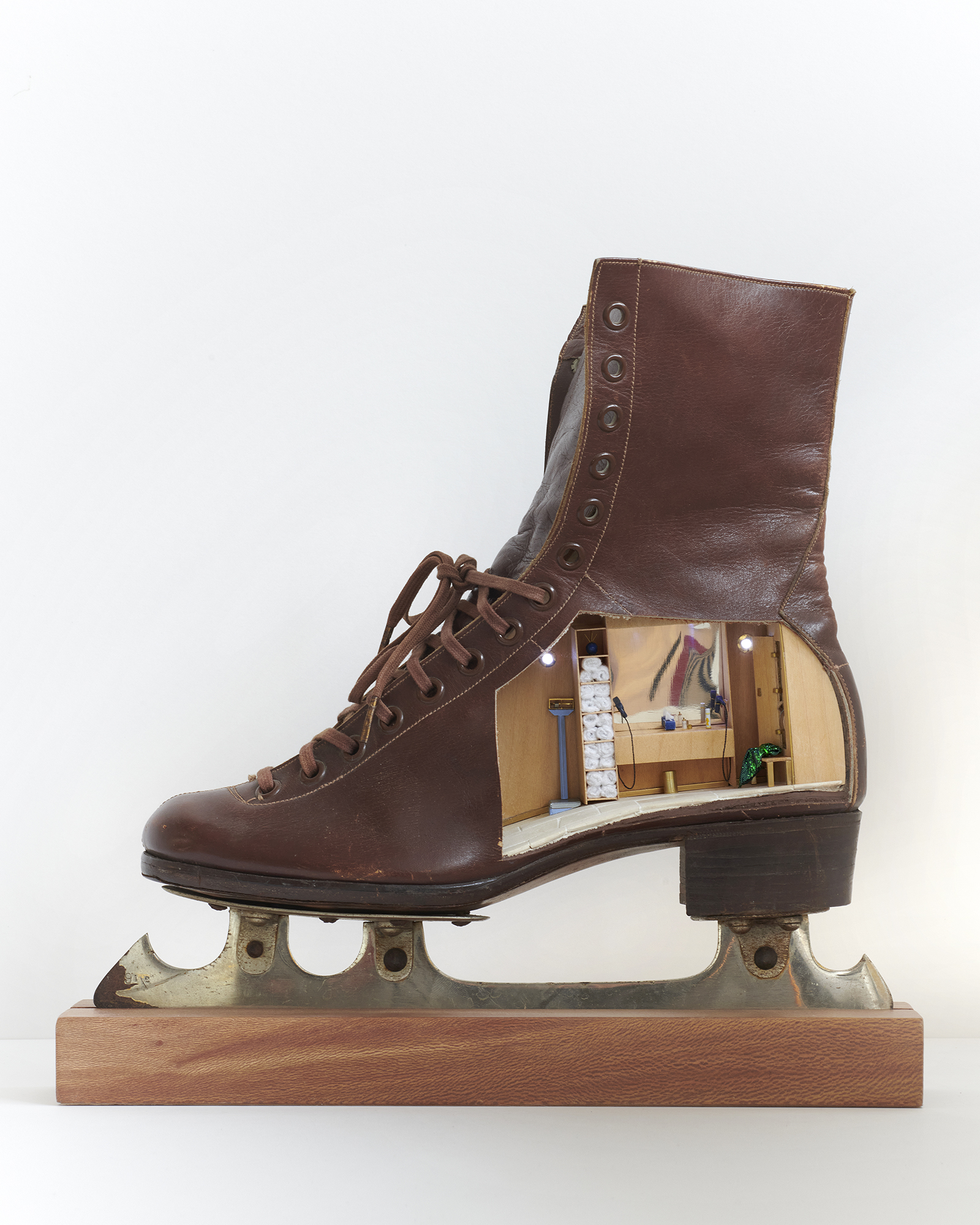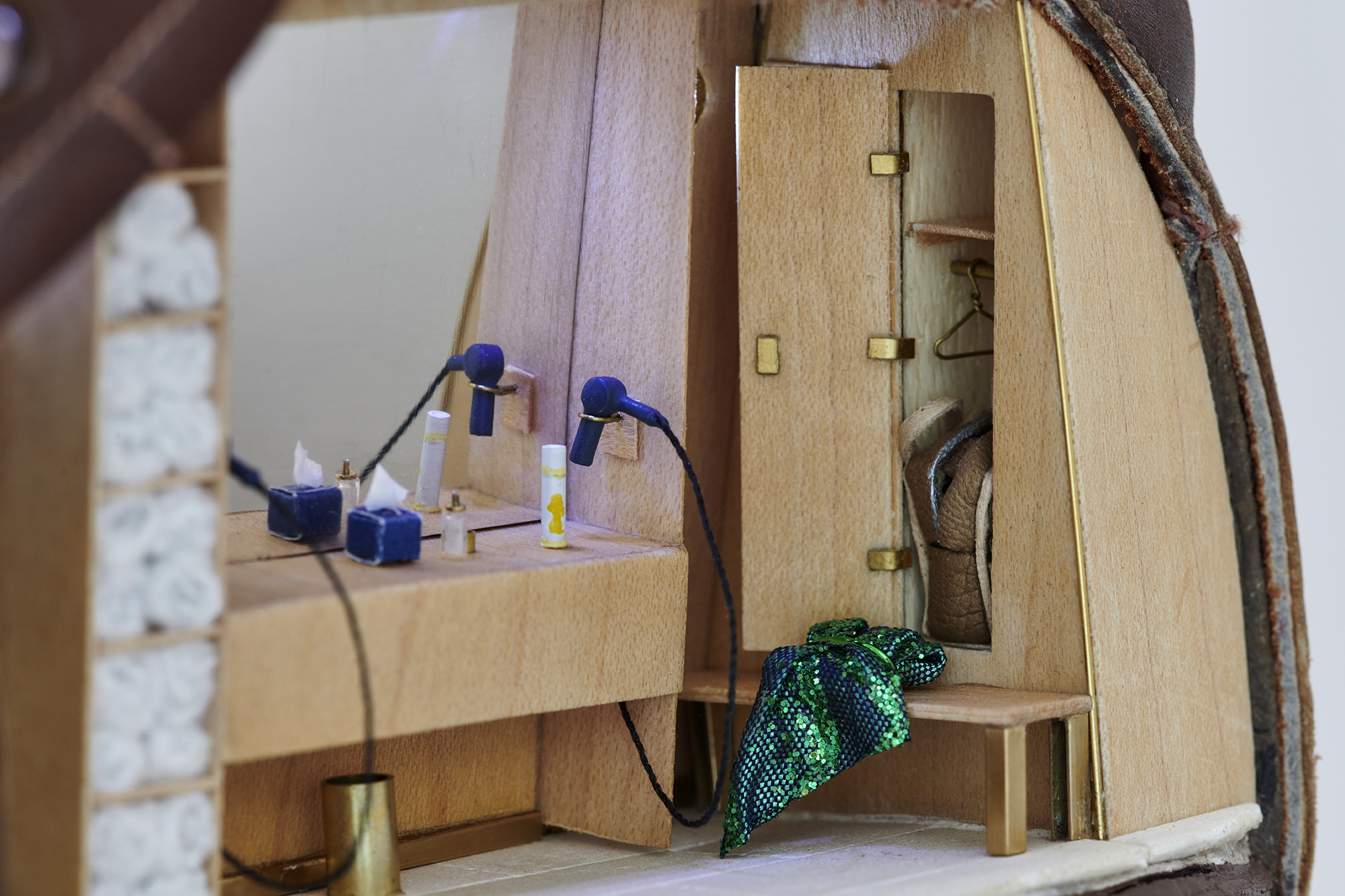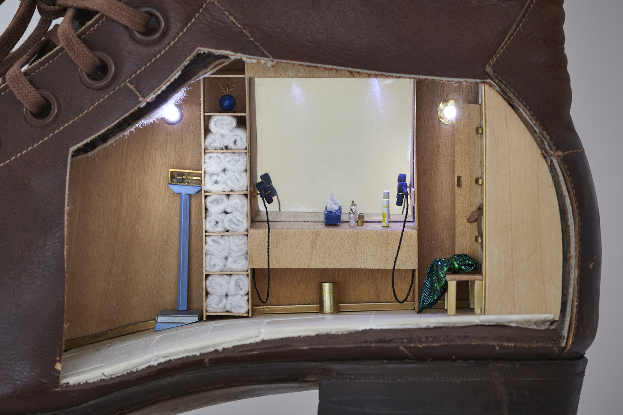 This is half of the piece “His’n’Hers”. A piece that plays with gender stereotypes. This changing room is built inside a well cared for 1930’s ice-skating boot and reflects the luxury changing rooms of the 1970’s.