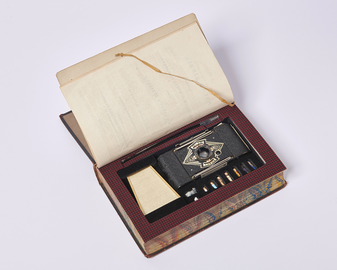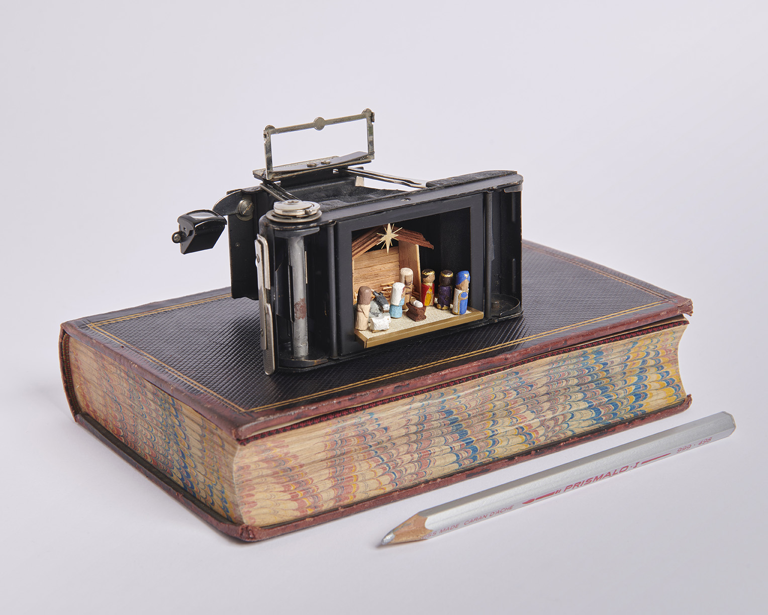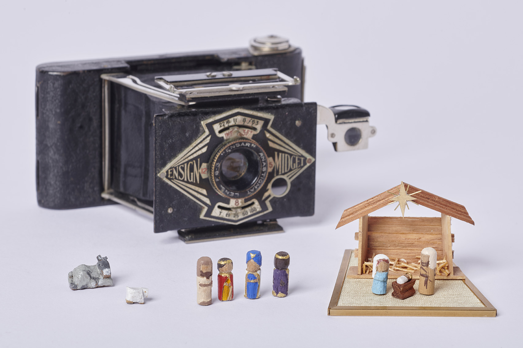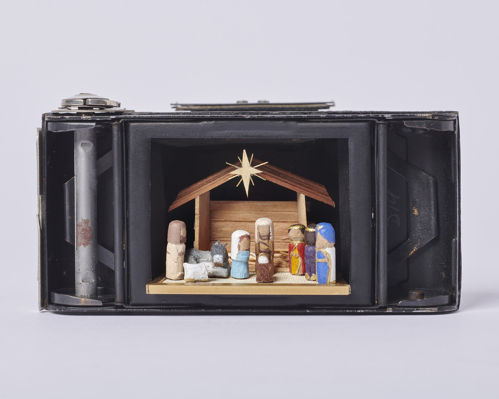 The camera is collectable in its own right, so it is not permanently adapted. The silk-covered magnetic floor is edged in brass and can be laid inside the camera’s bellows. On it a scene can be arranged using the 9 carved and painted walnut wood figures. Each figure has a tiny steel screw in the base that will allow it to stay where placed on the magnetic floor. There is also a detailed wooden stable with a brass star to be used as the traditional backdrop. All of the pieces fit snugly into bespoke spaces in a beautiful leather bound book which can also act as a base for the whole Christmas scene.