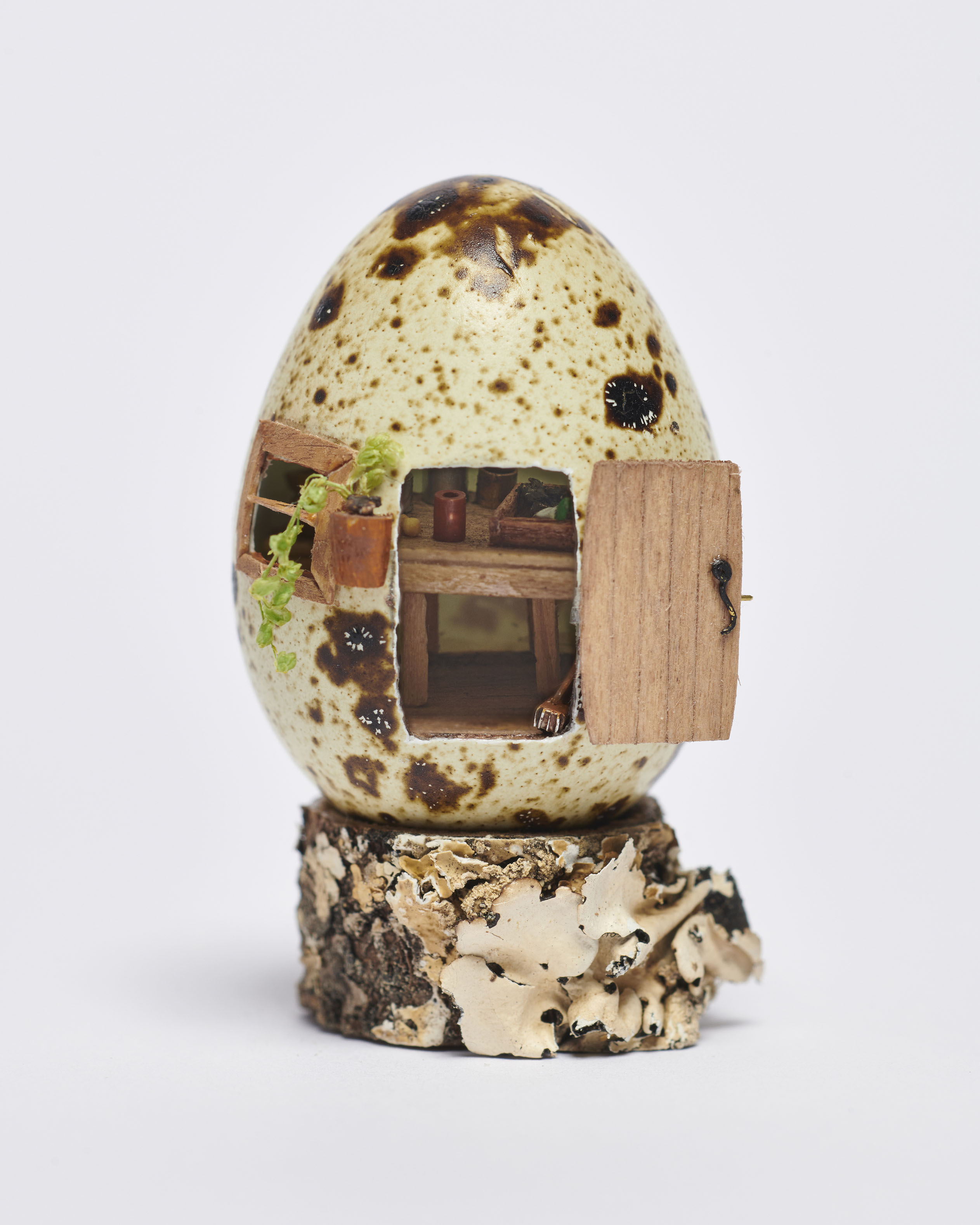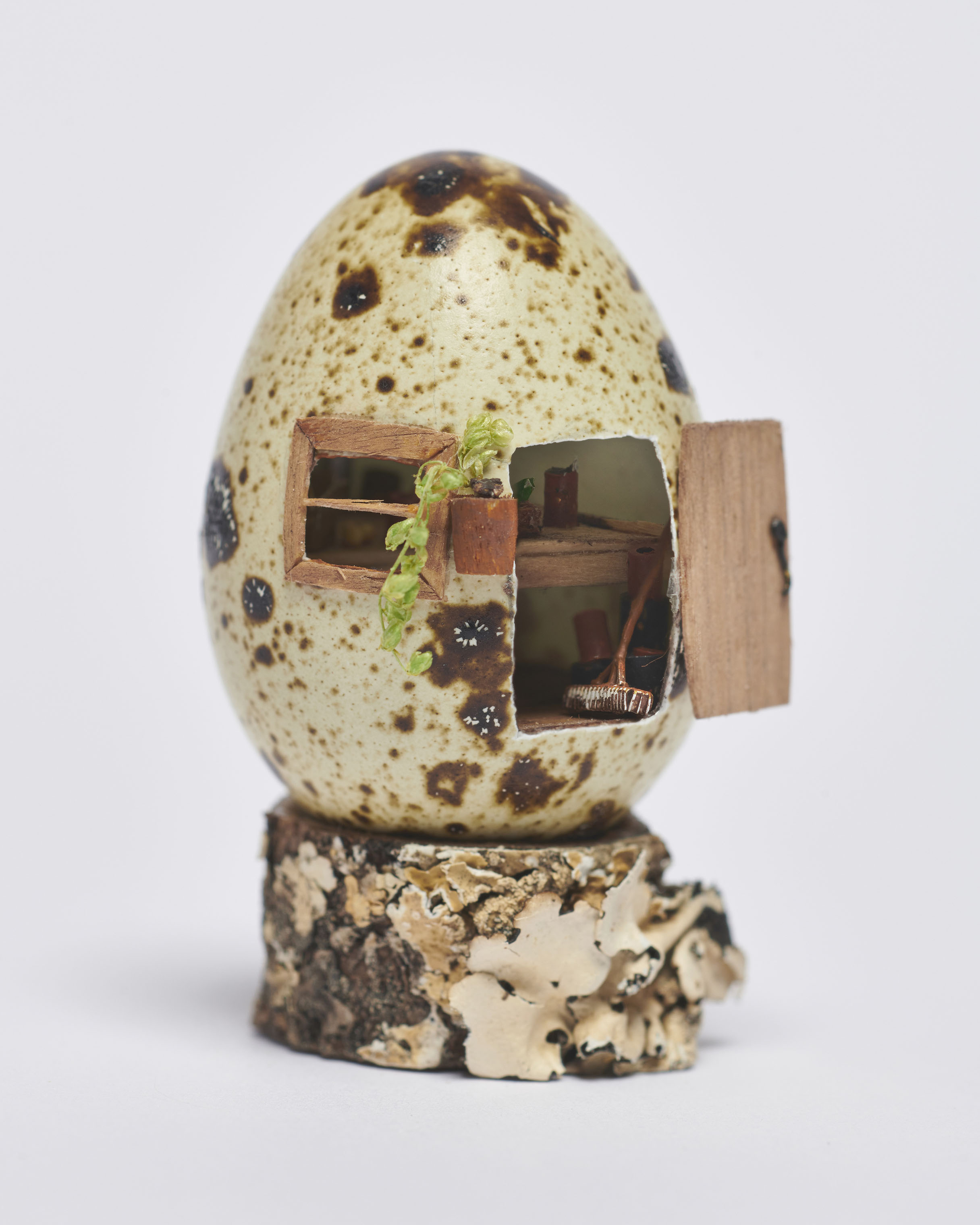 This tiny quail egg contains a potting bench with tray of soil and bulbs to be planted. A trowel is there to help. on the floor is a pile of old used but empty pots waiting to be filled. there is a tub of stored potatoes and a bag of potting compost. And a broom to tidy up with.