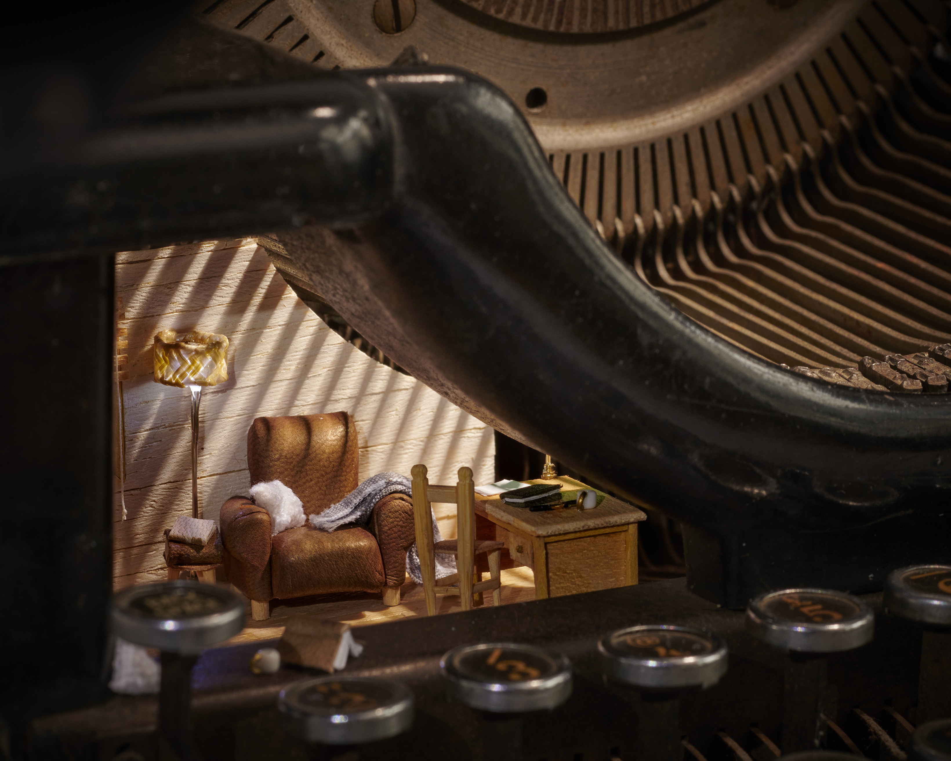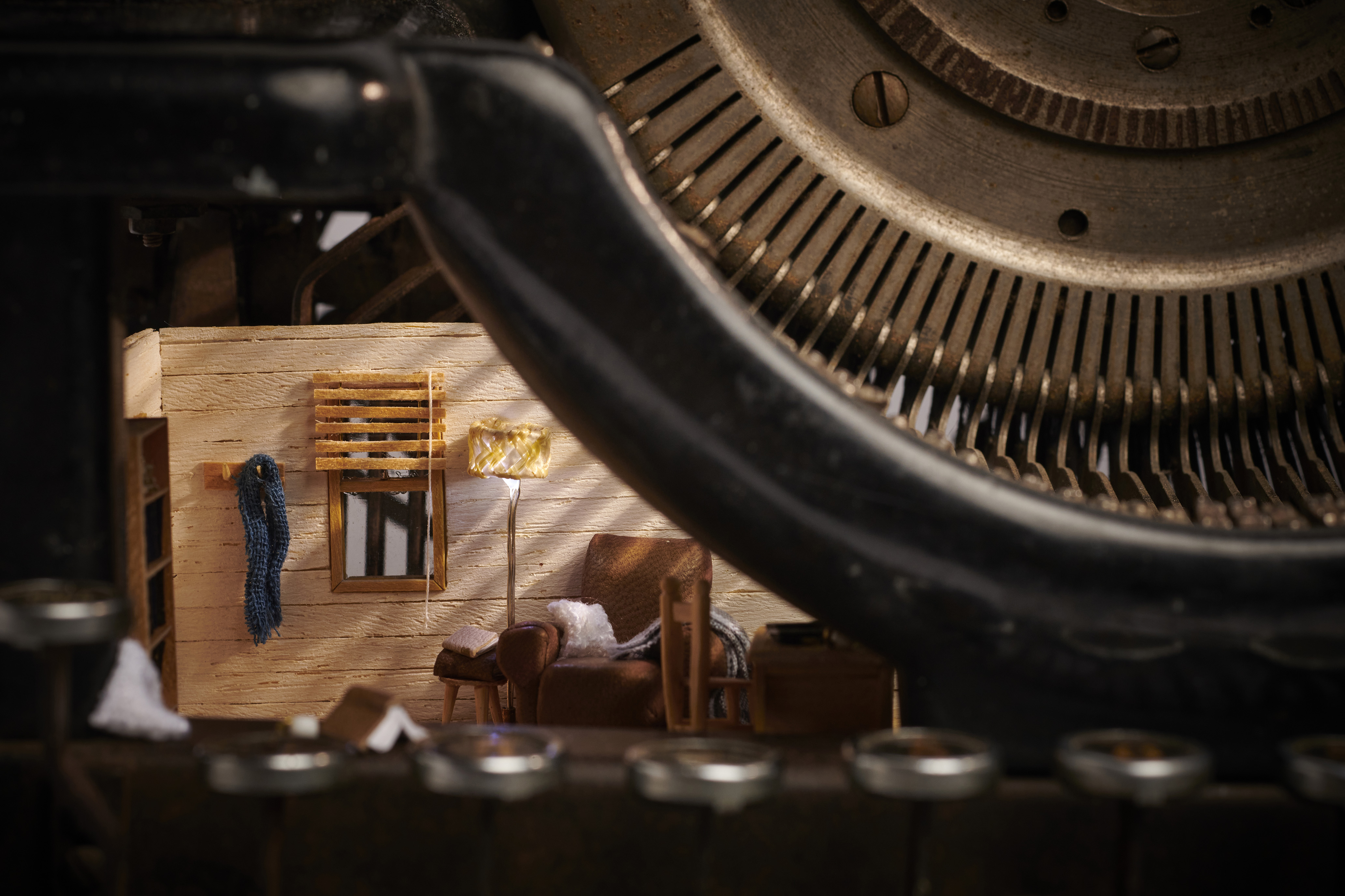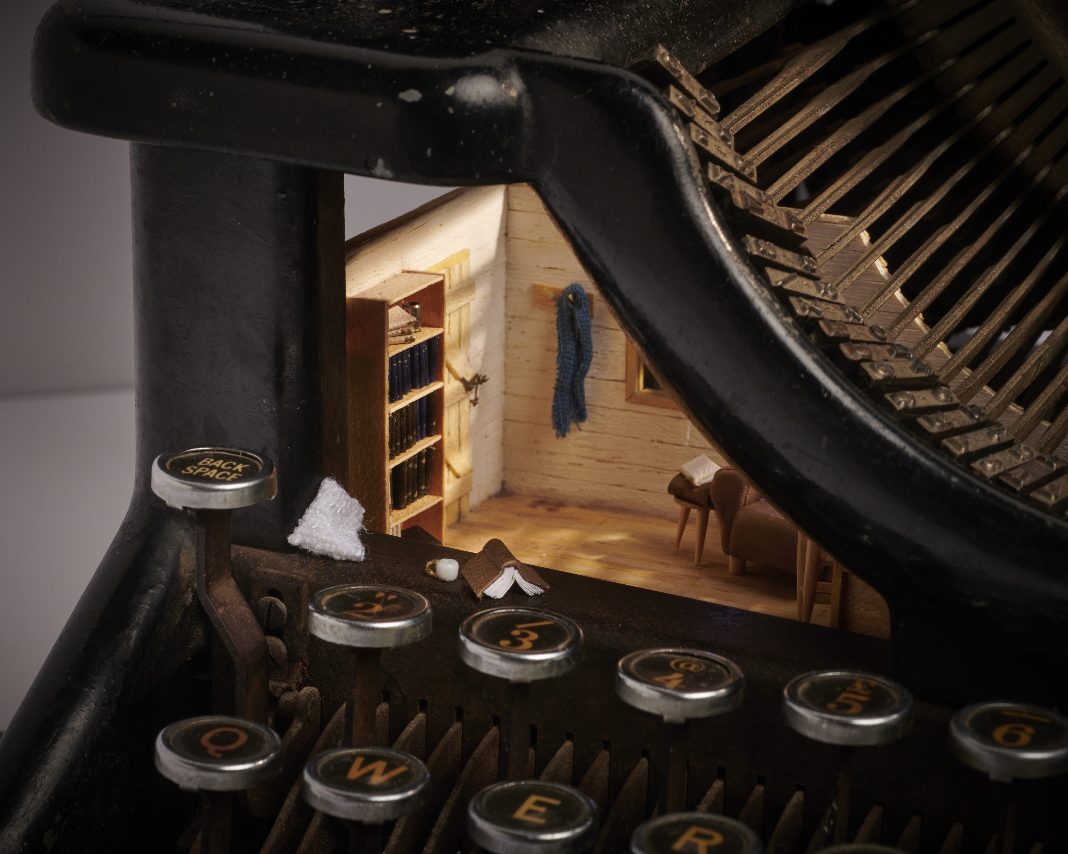 A vintage 20th century Woodstock typewriter containing a wood cabin writer’s retreat.
